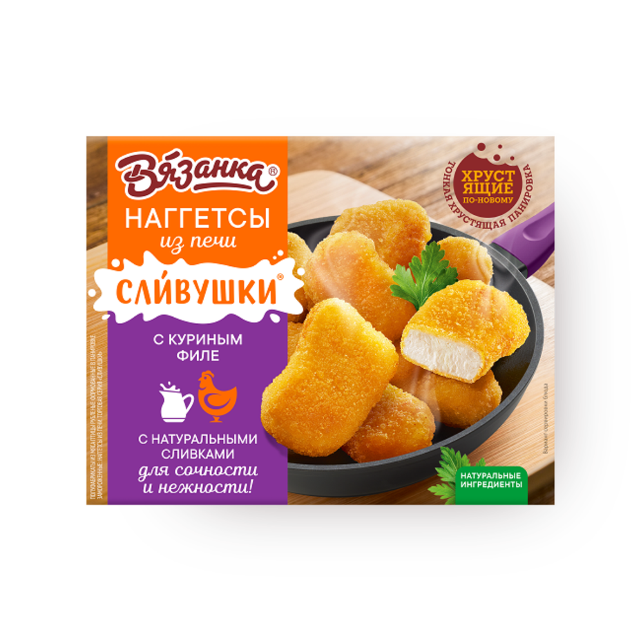 Филе грудки птицы с кожей, мясо цыплёнка-бройлера механической обвалки, жир говяжий, мука пшеничная, соевый белок, масло растительное, рисовый крахмал, молоко сухое, овощи сушёные, сухари панировочные: (мука пшеничная, вода питьевая), соль, чеснок, перец чёрный, вода питьевая, пищевая растительная клетчатка, яичные продукты, розмарин, антиокислители: аскорбиновая кислота L-, регуляторы кислотности (Е451, лимонная кислота), краситель аннато.