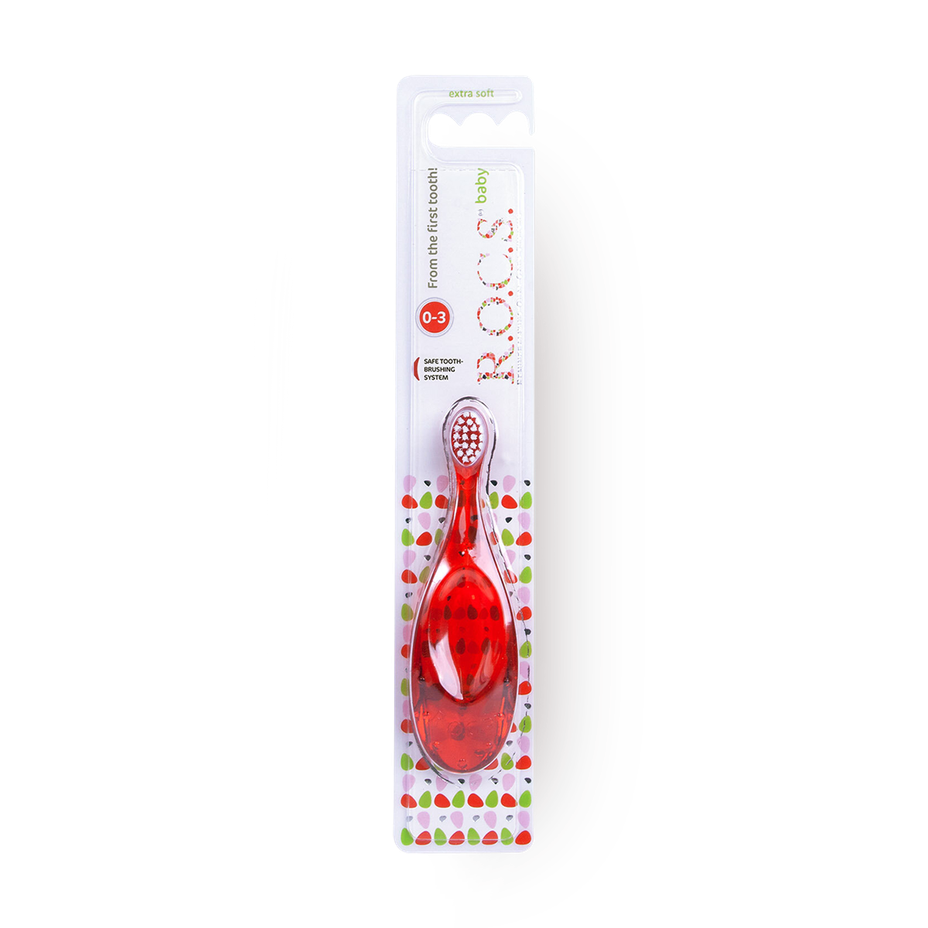 Эта щётка с мягкой щетиной подходит для малышей до 3 лет. Её удобно держать в маленькой руке, а головка бережно очищает первые зубки.
