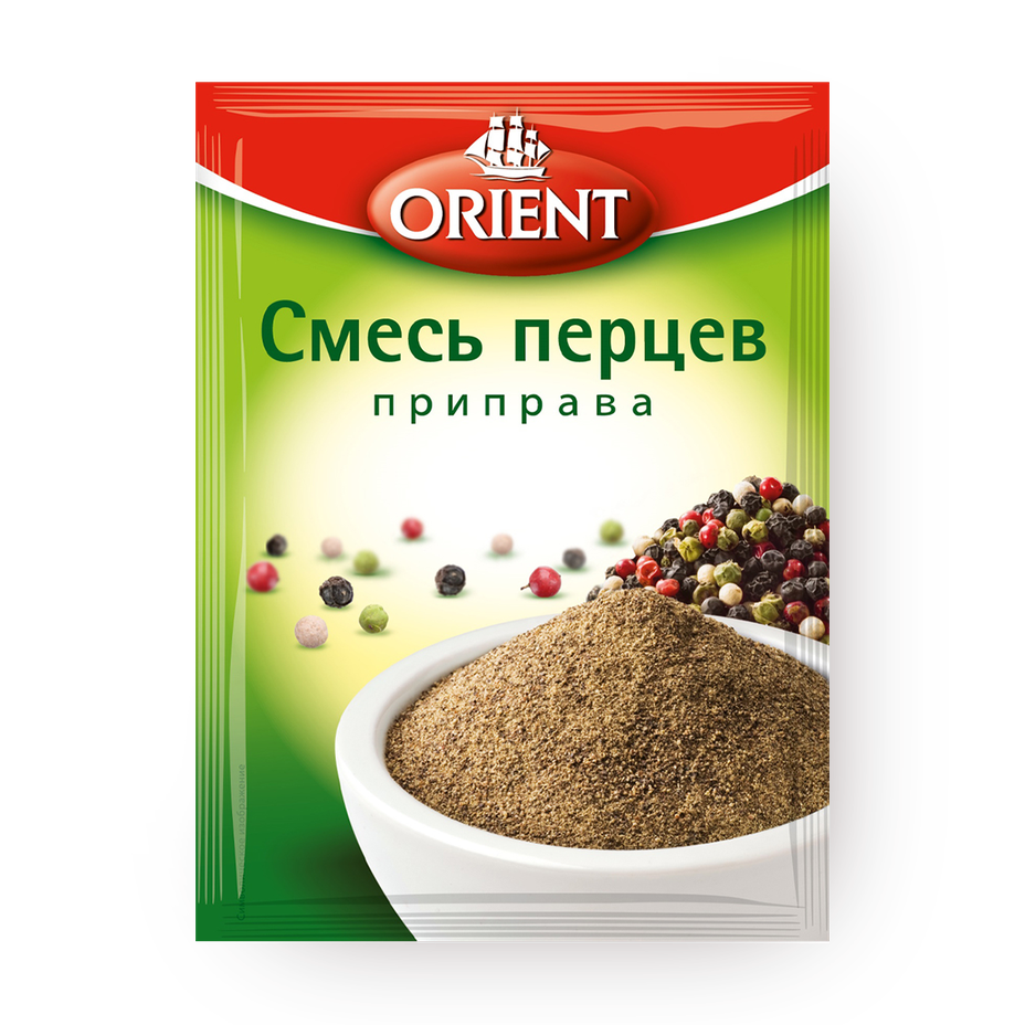 Эта смесь сочетает чёрный, белый, зелёный и розовый перец с кориандром и паприкой. Можно добавить в мясные блюда или овощные рагу.