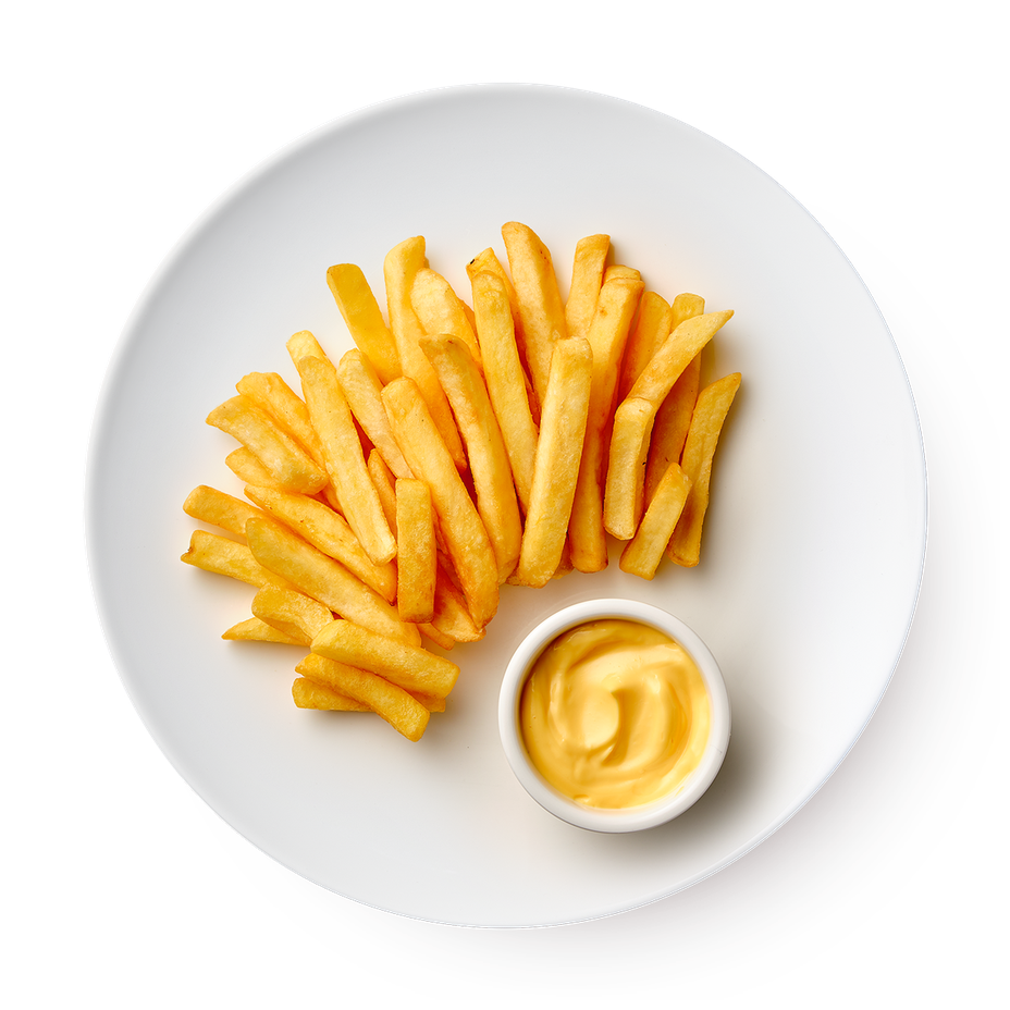 Картофель фри: картофель, панировка (загустители (Е1412, Е1414), рисовая мука, декстрин, разрыхлители (Е450, Е500), мальтодекстрин, загуститель Е415), масло подсолнечное с добавлением рапсового, соль, декстроза моногидрат, стабилизатор. Сырный соус: вода, масло подсолнечное рафинированное дезодорированное, (содержит уплотнитель Е509), продукты яичные, загустители (Е1422, Е415), сахар, соль, регулятор кислотности Е260, ароматизатор натуральный, сок лимонный концентрированный, консервант Е202, красители (Е100, Е160с), антиокислитель.