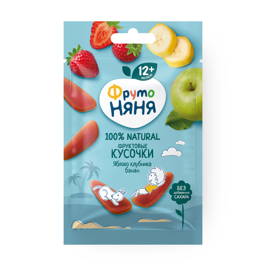 Фруктовые кусочки из яблока, клубники и банана подходят детям с 12 месяцев. В составе нет добавленного сахара, только натуральные сахара из фруктов.