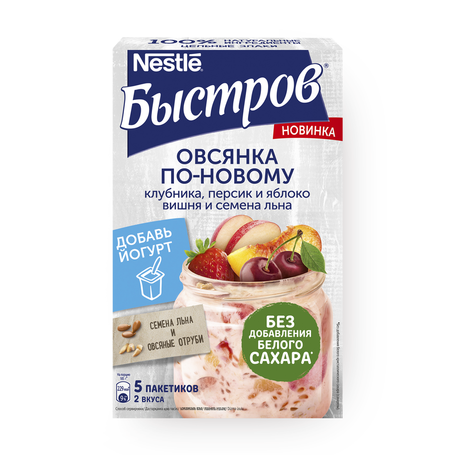 Каша овсяная без варки Овсянка по-новому «Быстров» ассорти (клубника, персик и яблоко и вишня с семенами чиа) порционная 5 шт.