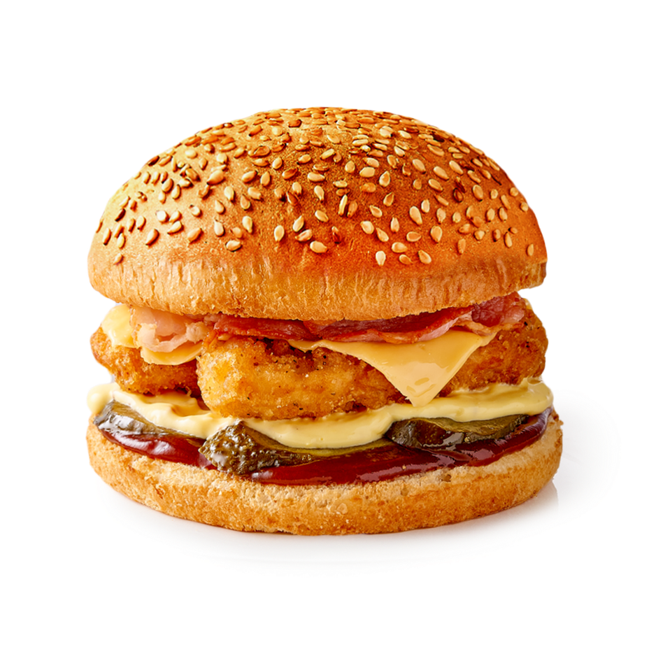 Этот бургер собрал куриные стрипсы, говяжий бекон и соус барбекю в мягкой булочке с кунжутом. Можно взять с собой или съесть сразу, если хочется чего-то сытного.
