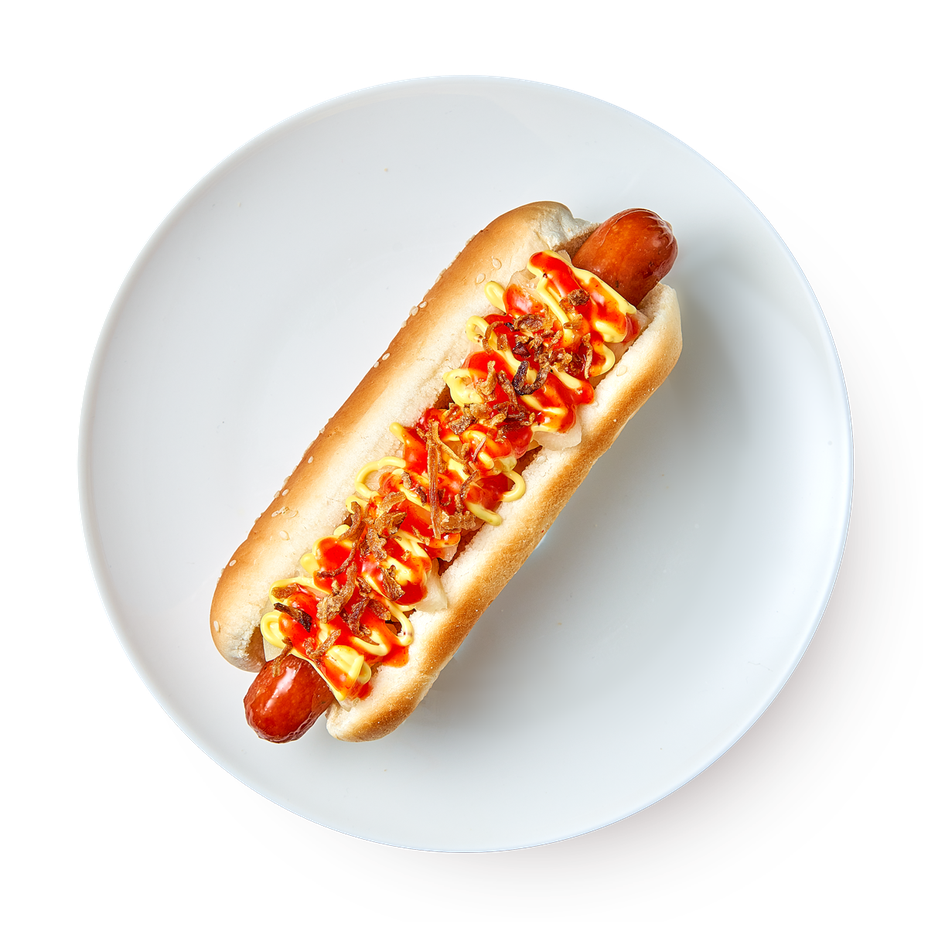 Этот хот-дог с куриной колбаской дополнен медово-горчичным соусом и жареным луком. Его можно взять с собой или съесть сразу.