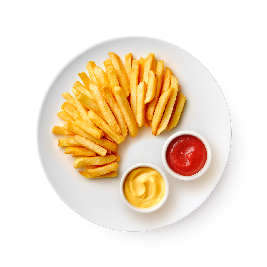 Картофель фри: картофель, панировка (загустители (Е1412, Е1414), рисовая мука, декстрин, разрыхлители (Е450, Е500), мальтодекстрин, загуститель Е415), масло подсолнечное с добавлением рапсового, соль, декстроза моногидрат, стабилизатор. Сырный соус: вода, масло подсолнечное рафинированное дезодорированное, (содержит уплотнитель Е509), продукты яичные, загустители (Е1422, Е415), сахар, соль, регулятор кислотности Е260, ароматизатор натуральный, сок лимонный концентрированный, консервант Е202, красители (Е100, Е160с), антиокислитель. Кетчуп: вода питьевая, томатная паста, уксус, сахар, соль, натуральные ароматизаторы (содержат сельдерей).