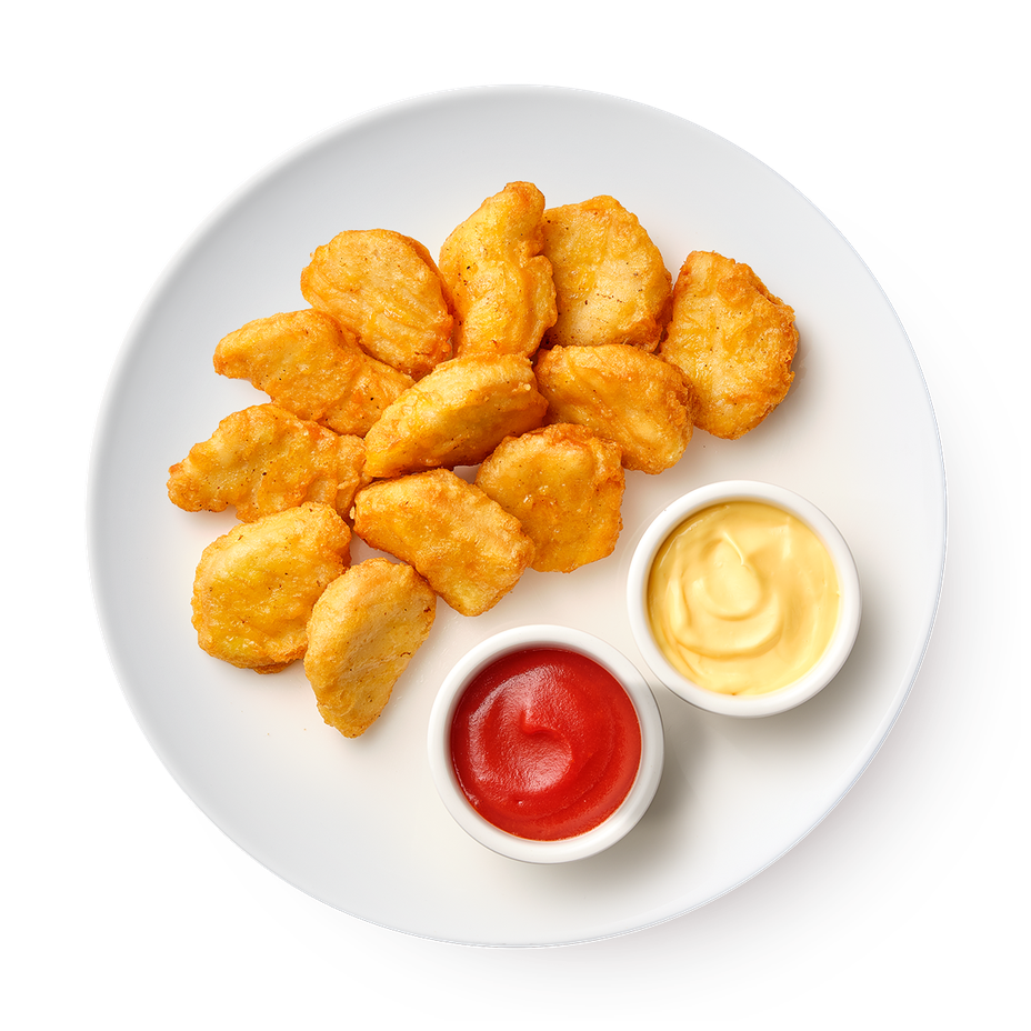 Хрустящие наггетсы с курицей подаются с кетчупом и сырным соусом. Их можно взять с собой или разогреть дома.
