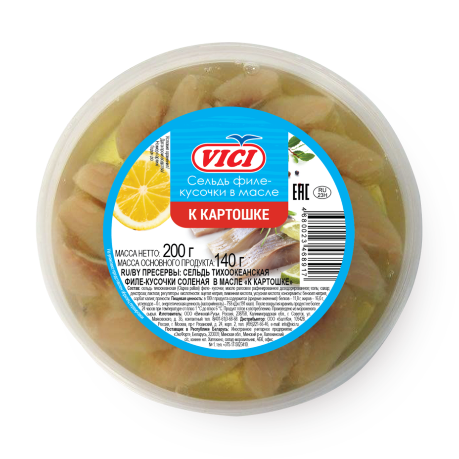 Сельдь тихоокеанская (Clupea pallasi) филе-кусочки; масло рапсовое рафинированное дезодорированное; соль; сахар; декстроза; лактоза; регуляторы кислотности: ацетат натрия, лимонная кислота, уксусная кислота; консерванты: бензоат натрия, сорбат калия; пряности.