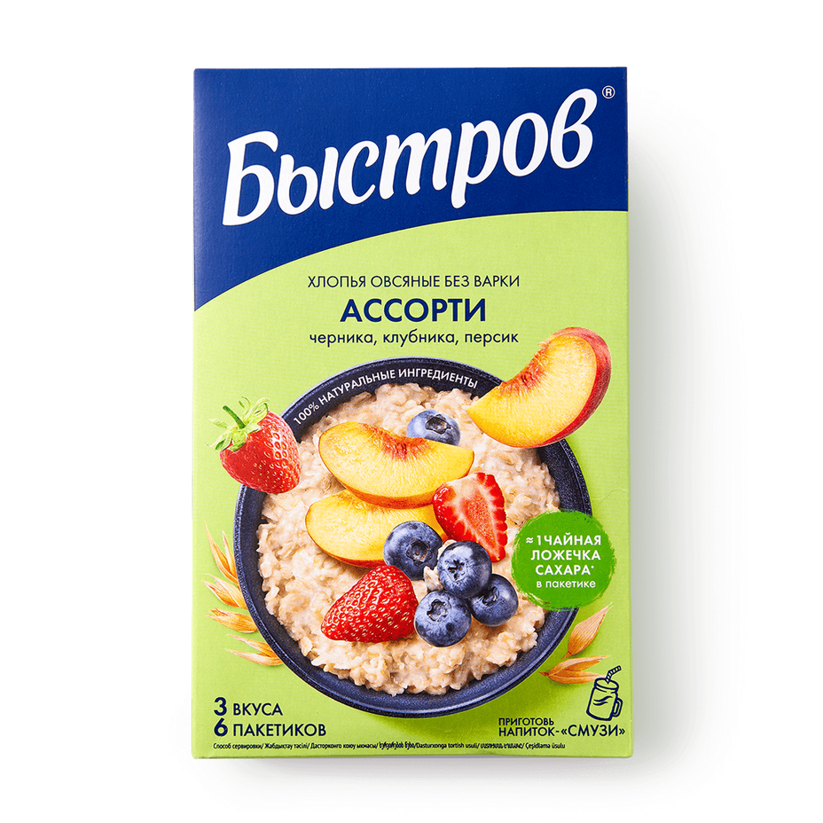 Хлопья овсяные без варки «Быстров» ассорти (черника-клубника-персик) 6 шт