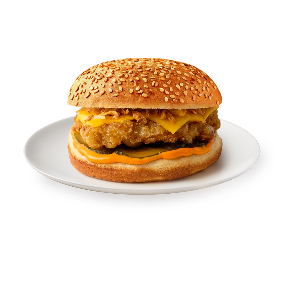 Этот бургер с куриными стрипсами и соусом «1000 островов» готов к употреблению после разогрева. В нём сочетаются хрустящая булочка с кунжутом, сыр и солёный огурец.