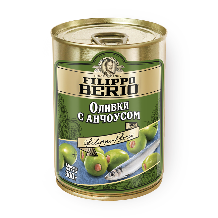 Оливки без косточки сорта мансанилья, вода, паста из анчоусов(вода, анчоус(рыба), загуститель-альгинат натрия (E-401)),соль пищевая, усилитель вкуса: глутамат натрия (Е-621), регуляторы кислотности: молочная кислота(Е-270), лимонная кислота (Е-330),антиокислитель: аскорбиновая кислота (Е-300).