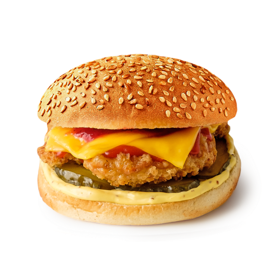 Этот бургер с курицей и беконом дополнен медово-горчичным соусом и солёным огурцом. В нём сочетаются хрустящая булочка с кунжутом и сочная начинка.