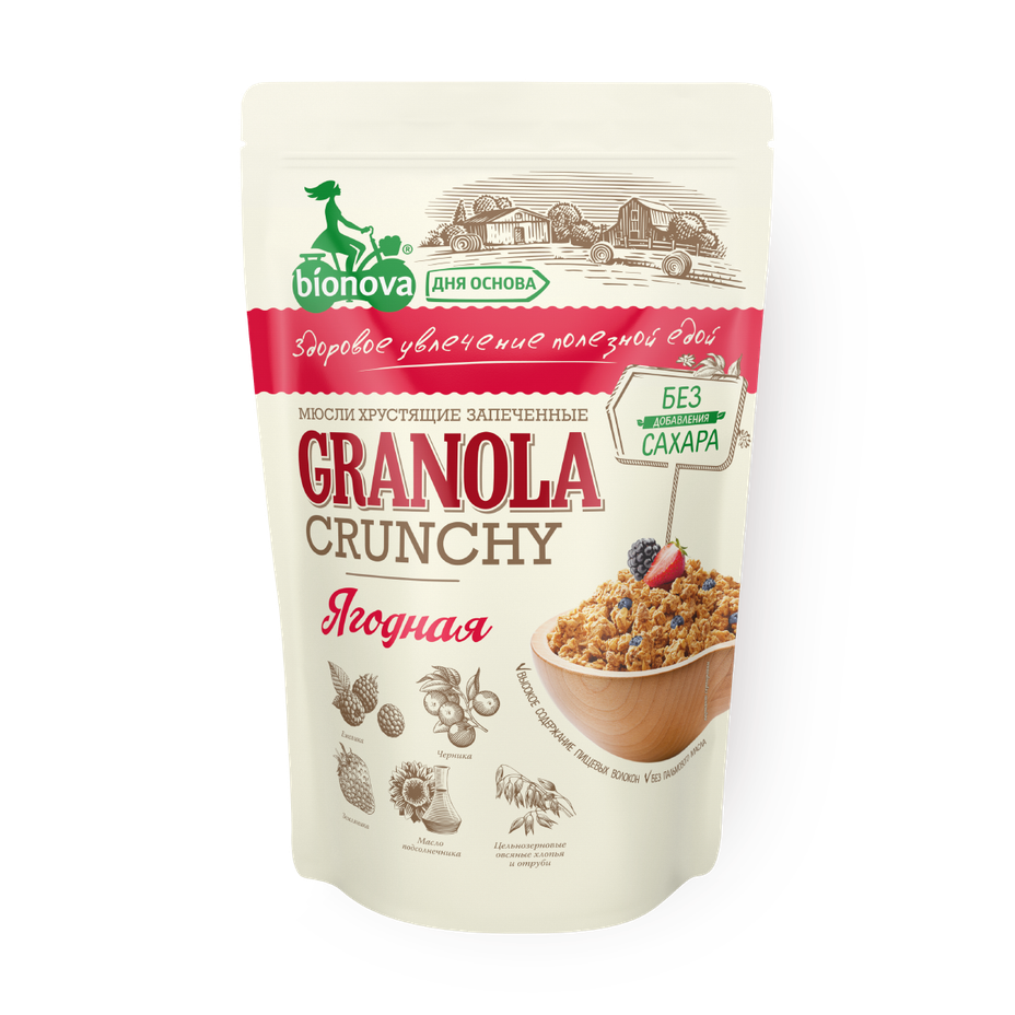 Запеченные хрустящие мюсли (цельнозерновые овсяные хлопья, растительные пищевые волокна, овсяные и пшеничные отруби, пшеничная и рисовая мука, подсолнечное масло, подсластитель натуральный эритрит - из растительного сырья, ячменный солод, соль), сушеные ягоды: земляника, ежевика, черника.