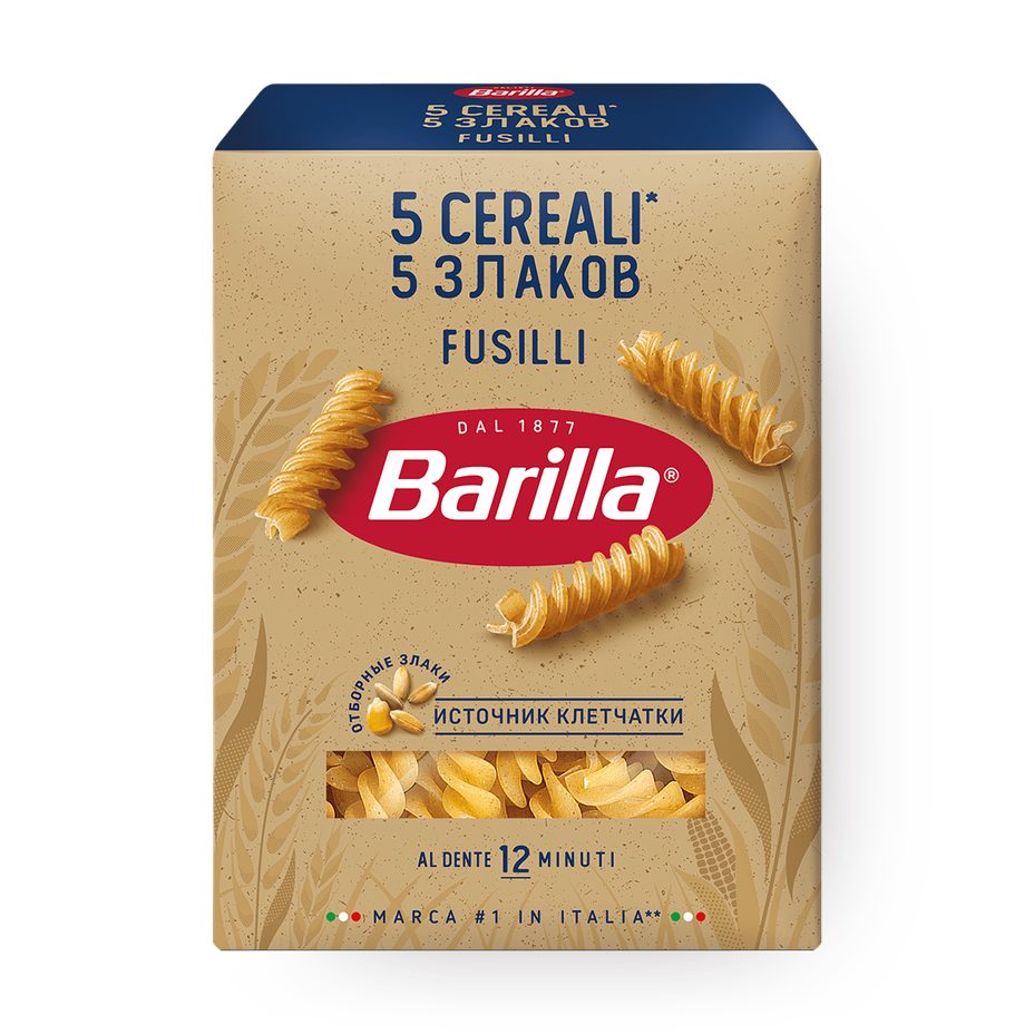 Вода, мука ячменная, мука ржаная цельнозерновая, кукурузная мука, мука из т/с пшеницы. В пасте Barilla 5 Cereali объединены все преимущества пяти злаков для ежедневного здорового рациона: каждый злак обладает своими уникальными свойствами, а все вместе они дополняют друг друга, обеспечивая превосходный баланс пользы и вкуса! Пшеница твердых сортов гарантирует идеальный аль денте. Кукуруза содержит полезные микроэлементы калий, фосфор и магний. Ячмень улучшает работу нервной системы за счет содержания витаминов группы В. Спельта содержит незаменимые аминокислоты, необходимые для работы головного мозга. Рожь улучшает работу ЖКТ, благодаря высокому содержанию клетчатки.