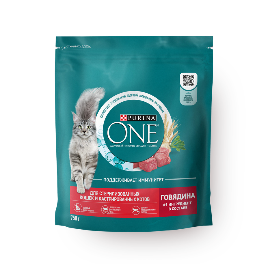 Этот корм с говядиной подходит для стерилизованных кошек. В нём есть клетчатка, которая помогает поддерживать здоровье питомца.