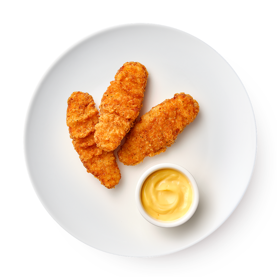 Этот продукт состоит из куриных стрипсов в панировке с сырным соусом. Можно взять в качестве закуски или дополнить ими основное блюдо.
