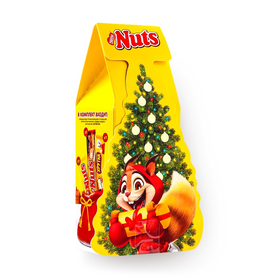 Nuts Конфета с фундуком и арахисом: сахар, патока, молоко сухое обезжиренное, жир специального назначения (масло пальмовое), фундук, эквивалент масла какао (масло пальмовое, масло ши), арахис, какао тёртое, сыворотка молочная сухая, молочный жир, молоко сухое цельное, масло какао, эмульгаторы (лецитины, Е476), белок яичный сухой, ароматизаторы натуральные, регулятор кислотности (лимонная кислота), соль. Nuts Космический вкус пекан: cахар, патока, жир специального назначения (из пальмового масла), фундук целый, молоко сухое обезжиренное, какао тёртое, масло какао, сыворотка молочная сухая, арахис, молочный жир, эквивалент масла какао (масло пальмовое, масло ши), молоко сухое цельное, какао-порошок, эмульгаторы (летицины, E476), белок яичный сухой, ароматизаторы натуральные, регулятор кислотности (лимонная кислота). Хрутка Нуга и карамельный топинг: сахар, патока, жир специального назначения (из пальмового масла), молоко сухое обезжиренное, какао тёртое, масло какао, карбонат кальция, сыворотка молочная сухая, молочный жир, эквивалент масла какао (масло пальмовое, масло ши), белок яичный сухой, эмульгаторы (лецитины, Е476), ароматизаторы натуральные, регулятор кислотности (лимонная кислота).