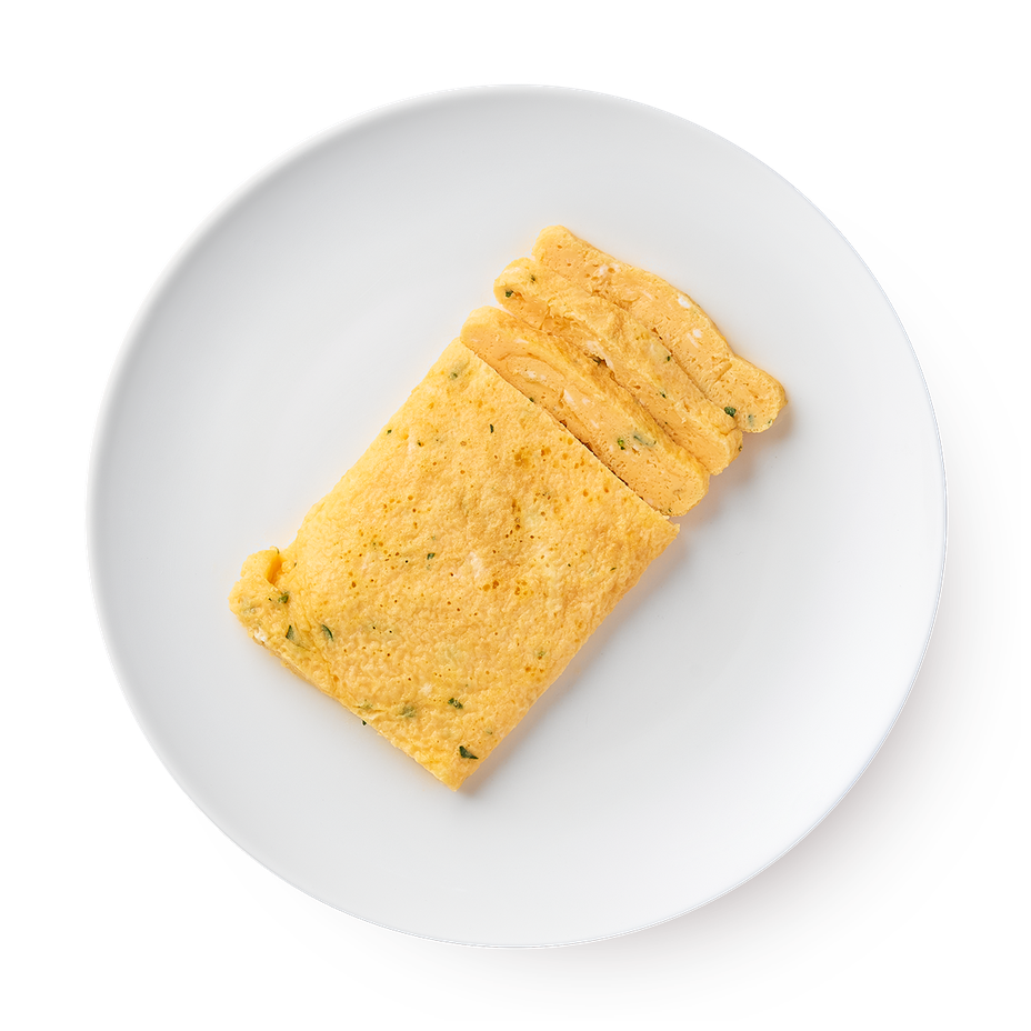 Этот омлет приготовили на сливочном масле, которое придаёт ему нежный вкус. В составе есть куриные яйца и зелень петрушки.