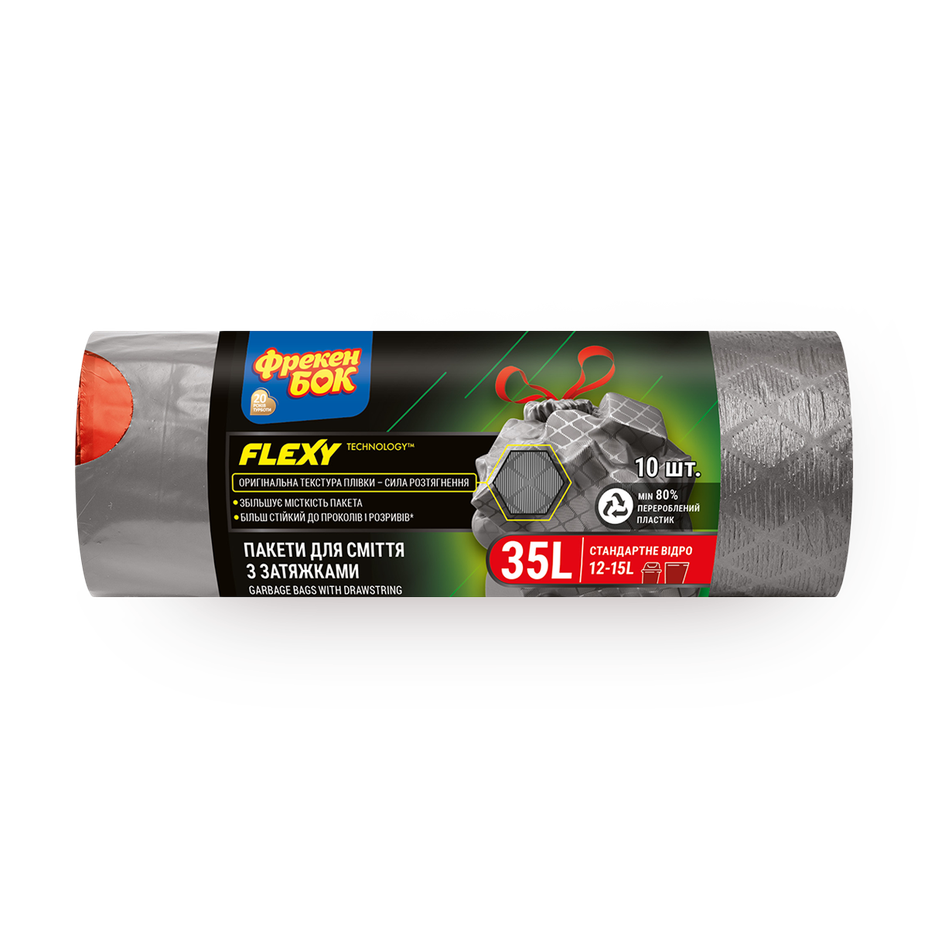 Эти пакеты с затяжкой удобно фиксируются на краю ведра. Они подходят для бытового мусора и выдерживают до 35 литров.