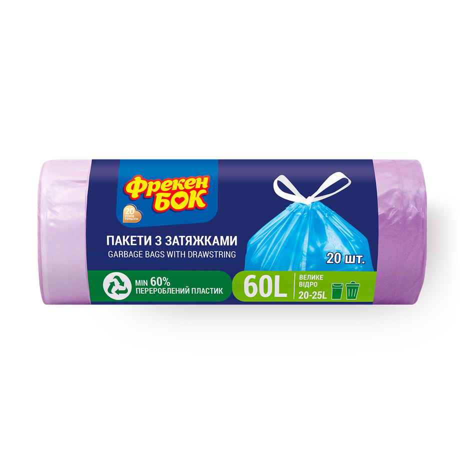 Фиолетовые мешки для мусора объёмом 60 литров с удобной затяжкой. В упаковке 20 штук, которые подойдут для бытового использования.