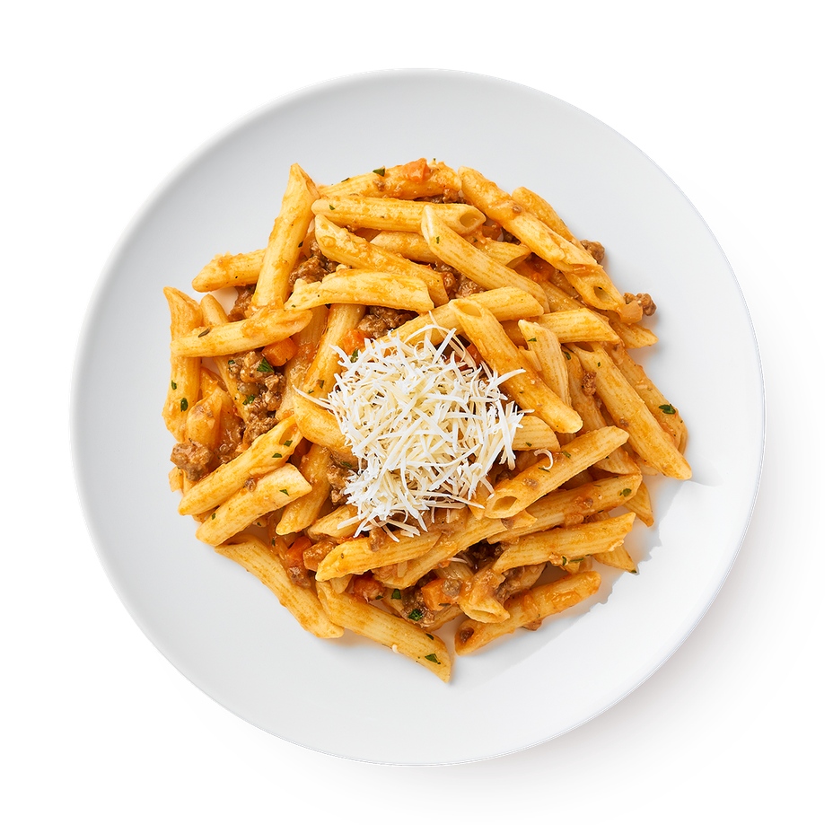 Паста с говяжьим фаршем и соусом болоньезе, который готовят с добавлением пармезана и зелени. Можно разогреть и подать как полноценный обед или ужин.
