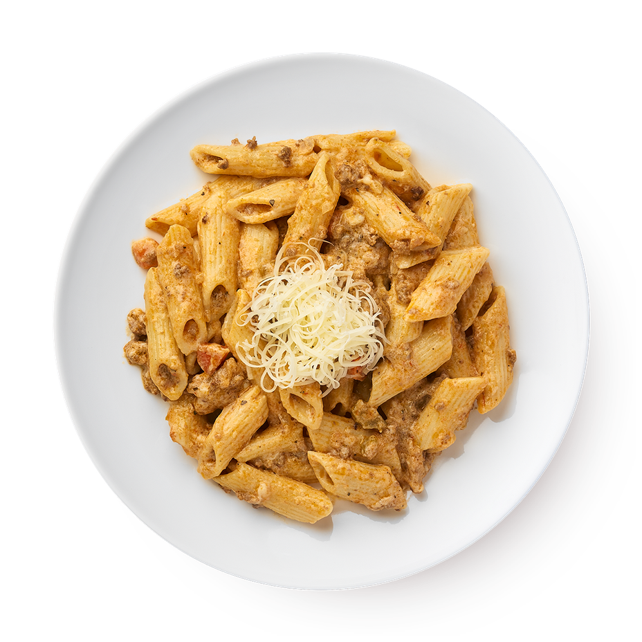 Эта паста с соусом болоньезе сочетает говядину, курицу и овощи. В комплекте идёт сырный соус и пармезан для завершения блюда.