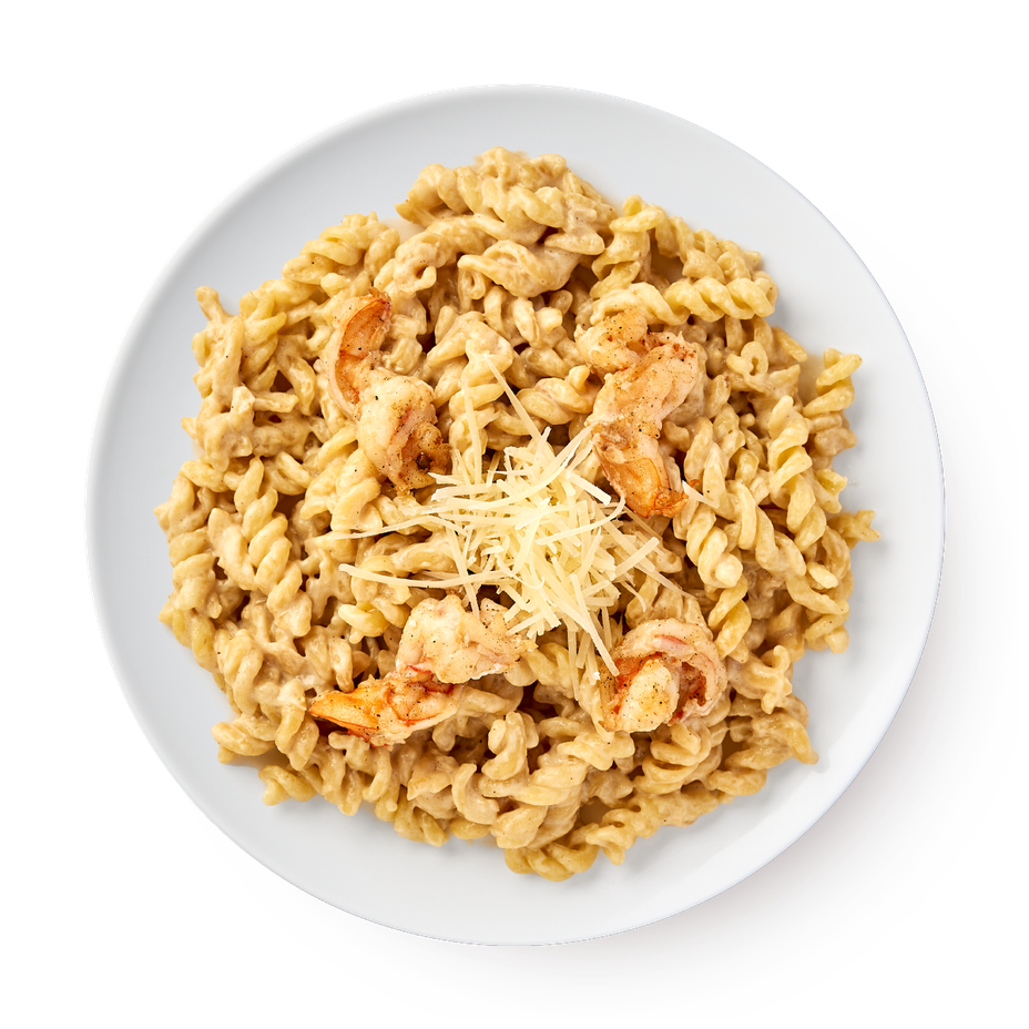 Макароны фузилли (макароны, масло растительное, соль пищевая йодированная мелкая), соус (соус бешамель (молоко, сливки, мука, масло сливочное, соль пищевая йодированная, чеснок, тимьян), бульон куриный (кости куриные, лук репчатый, морковь, соль пищевая йодированная), сливки, лук репчатый, соус соевый, креветки тигровые жареные (креветки, масло растительное), сыр пармезан.