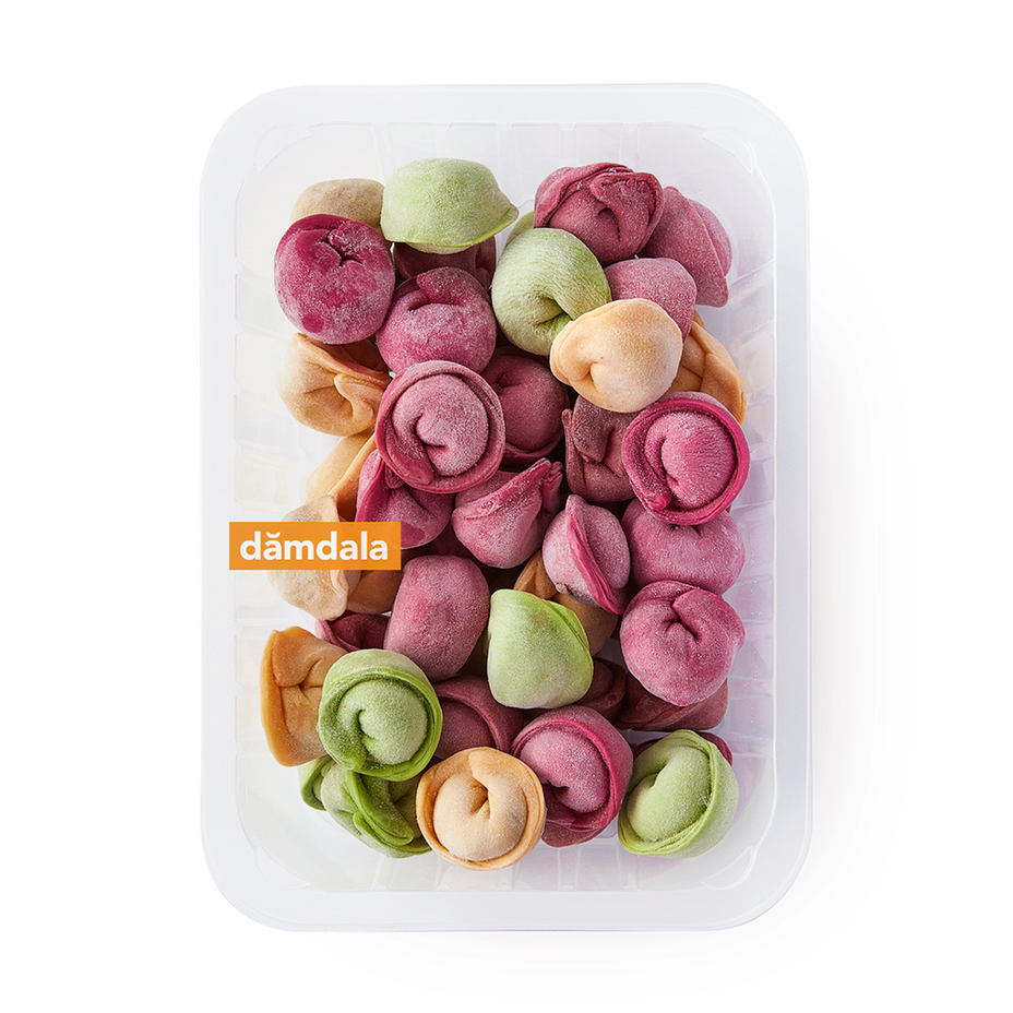 Тесто (мука пшеничная высшего сорта, соль морская, сметана 15%, яйца куриные, яичные желтки, масло подсолнечное, свекла, морковь, шпинат или зелень), начинка (лук репчатый, фарш из телятины 20%, соль морская, перец чёрный молотый).