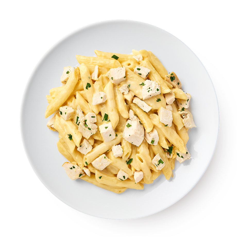 Пенне с курицей и сырным соусом, который приготовлен на сливочном масле и молоке. Это блюдо можно разогреть в микроволновке или на сковороде.
