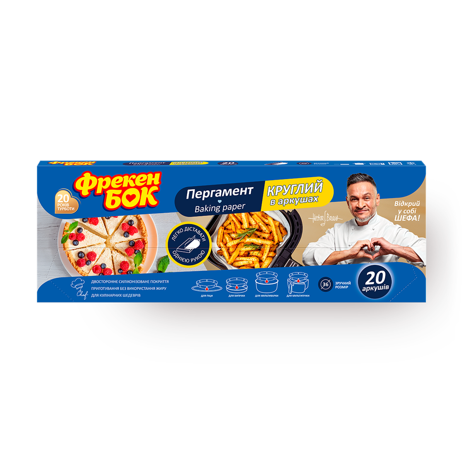 Этот пергамент подходит для выпечки в круглых формах диаметром 360 мм. В упаковке 20 листов, которые легко отделяются друг от друга.