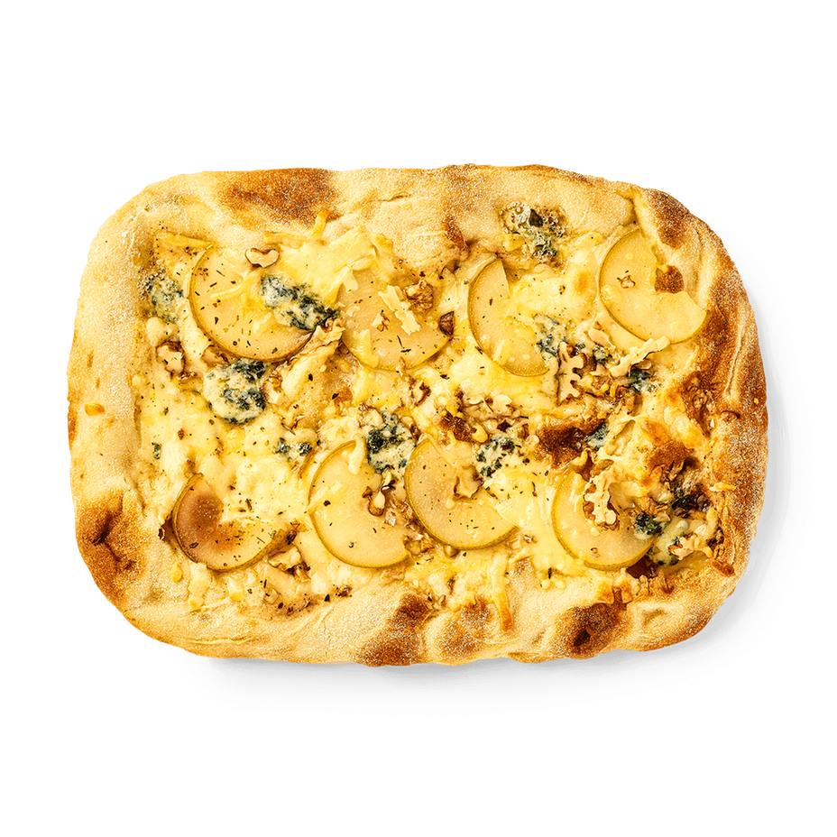 Основа для пиццы, соус бешамель (молоко, сливки, мука пшеничная, масло сливочное, соль пищевая йодированная, чеснок, тимьян), сыр моцарелла, груша конфи (груша, сахар песок, концентрат лимонный), сыр бри, сыр дорблю, сыр пармезан, орех грецкий, специя орегано, перец чёрный молотый.