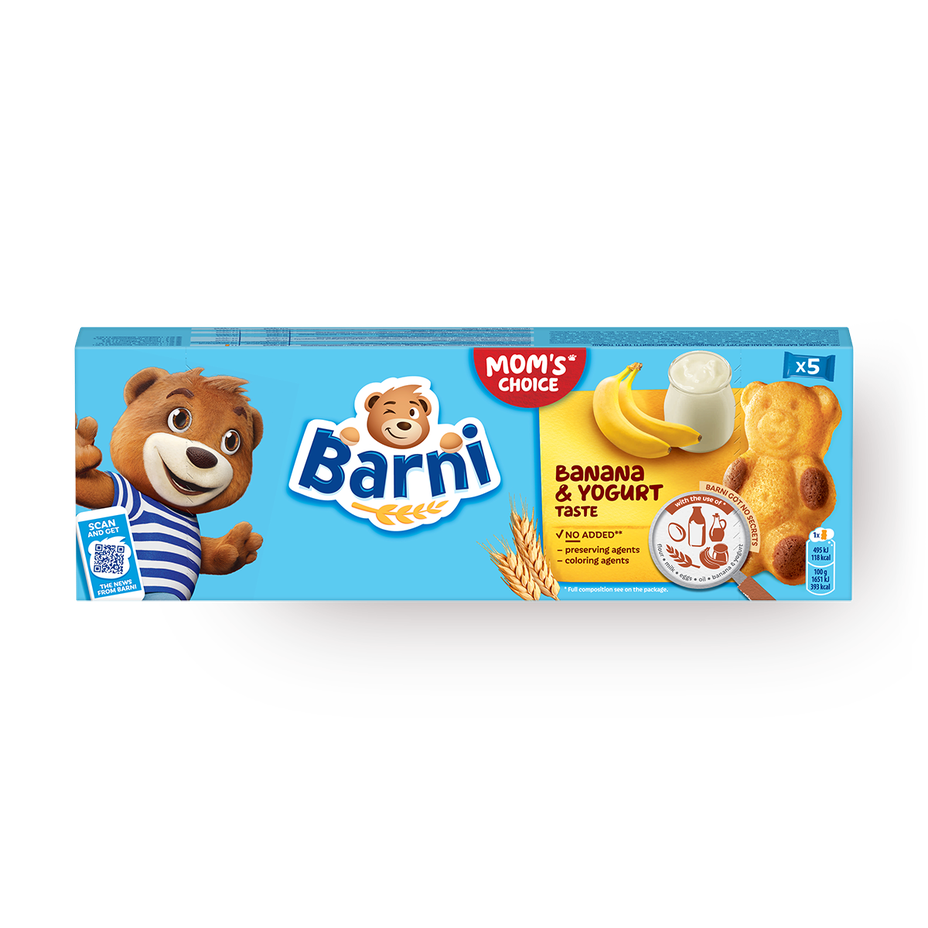 Мука пшеничная, сироп глюкозно-фруктозный, сахар, яйцо, вода питьевая, масло рапсовое, сухое обезжиренное молоко и сухое цельное молоко, влагоудерживающий агент (глицерин), масло пальмовое, декстроза, эмульгаторы (эфиры глицерина и молочной и жирных кислот, эфиры полиглицерина и жирных кислот), разрыхлители, дигидропирофосфат натрия и гидрокарбонат натрия), сухой йогурт, банановый порошок, соль поваренная пищевая, сухая молочная сыворотка, какао-порошок, ароматизаторы идентичные натуральным (банан, ванилин), загуститель (гуаровая камедь), регулятор кислотности (лимонная кислота).