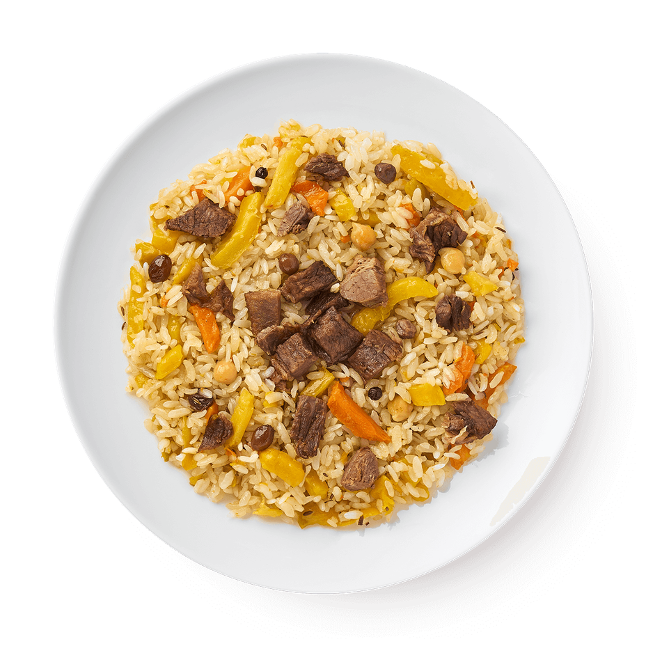 Этот плов приготовили с говядиной, нутом и изюмом по традиционному рецепту. Его можно разогреть в микроволновке или на сковороде.
