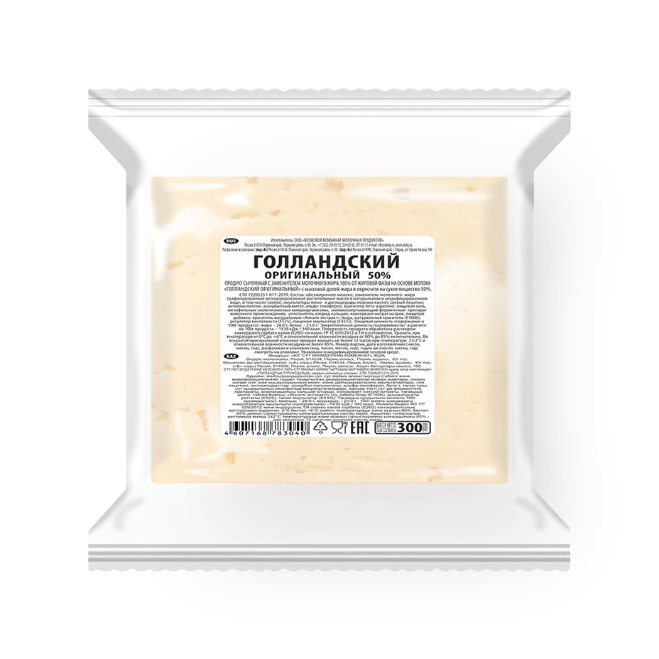 Продукт сычужный с заменитетем молочного жира 100% от жировой фазы на основе молока 'Голландский оригинальный' с массовой долей жира в пересчете на сухое вещество 50%, массовая доля жира 50%.