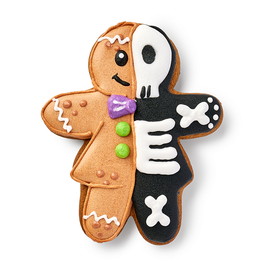 Тесто пряничное (мука пшеничная, сахар песок, маргарин, мёд, яйцо куриное, сода пищевая, корица молотая, имбирь сухой молотый, орех мускатный), глазурь пряничная белая (пудра сахарная, белок яичный, кислота лимонная), краситель гелевый.