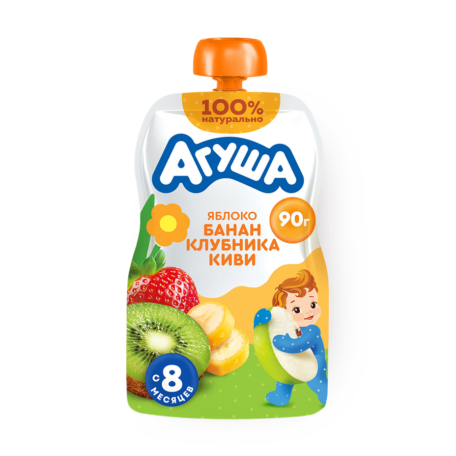 Пюре с яблоком, бананом, клубникой и киви подходит для детей с 8 месяцев. Его можно взять с собой или подать в качестве десерта.