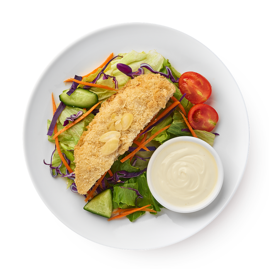 Шницель куриный: филе куриное, яйцо куриное, сухари панировочные, мука пшеничная, соль пищевая йодированная, перец ч/м; Соус: майонез, сахар, уксус рисовый, соус горчичный, масло кунжутное, соль пищевая йодированная; капуста пекинская, помидоры черри, огурцы, морковь, капуста краснокочанная, миндальные лепестки.