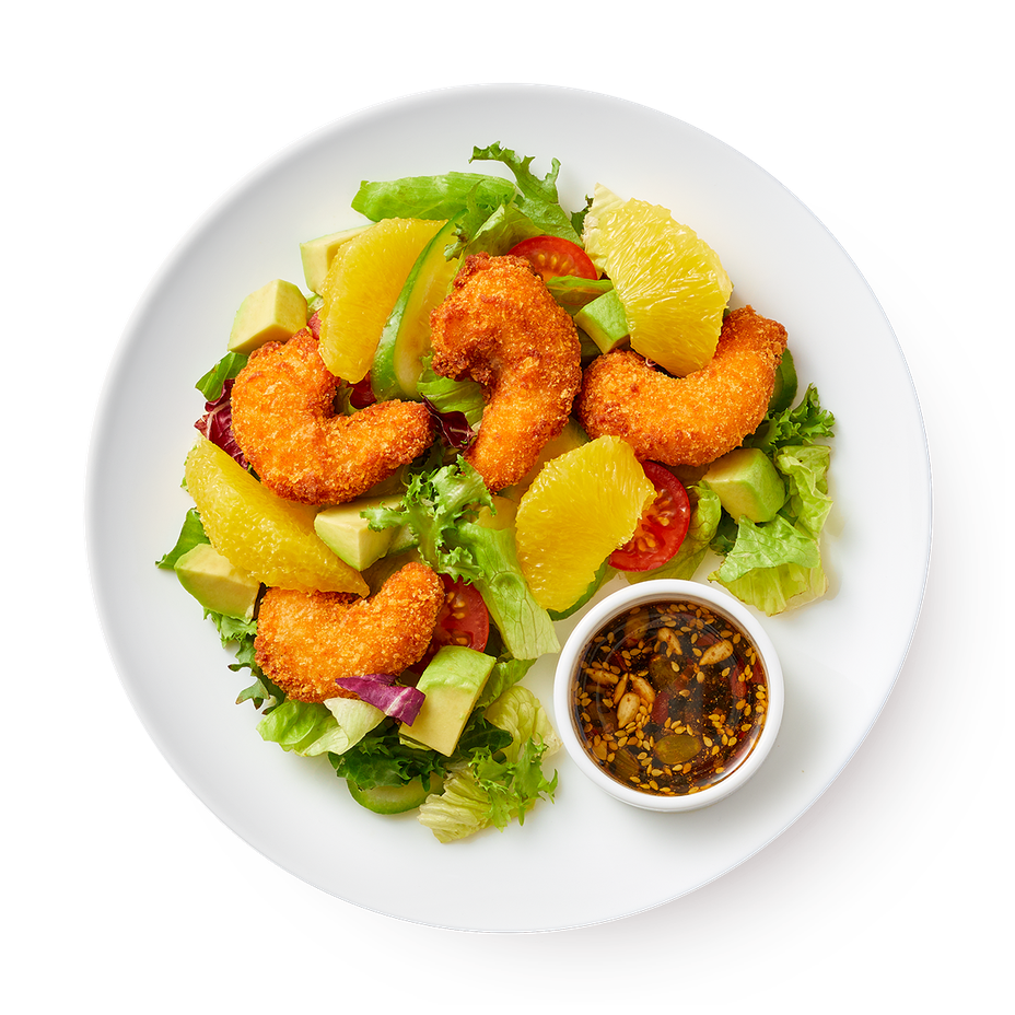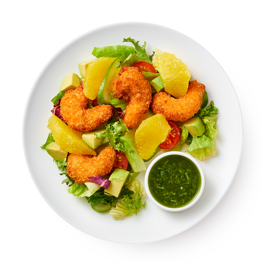 Смесь салатов айсберг, радиччо, фриссе. Креветки, сухари панировочные (мука пшеничная хлебопекарная высший сорт, вода, дрожжи хлебопекарные сухие, соль, сахар, масло подсолнечное рафинированное дезодорированное), вода питьевая, смесь муки (мука пшеничная, рисовая мука, кукурузный крахмал, стабилизатор дигидропирофосфат натрия, соль), помидоры Черри, огурцы свежие, авокадо Хаас, апельсин свежий. Заправка: масло растительное, сок апельсиновый, соевый соус, перец чёрный молотый, имбирь сушёный, перец красный хлопья, чеснок сухой, соль, семена тыквы, семена подсолнуха, кунжут чёрный, кунжут белый.