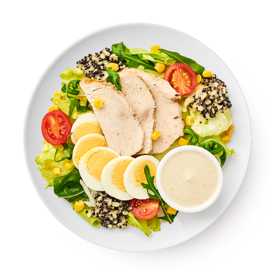 Яйцо, индейка су-вид (филе грудки индейки, соль пищевая йодированная, базилик сухой, паприка сладкая, перец чёрный молотый, чеснок), микс салата (салат айсберг, капуста пекинская, рукола), томаты черри, кукуруза консервированная, гарнир булгур с киноа (булгур отварной, киноа отварное, соль пищевая йодированная), витела тонато (майонез, масло растительное, яйцо, концентрат лимонный, масло оливковое, горчица дижонская, соль пищевая йодированная, тунец консервированный, уксус винный, масло чесночное, петрушка, каперсы консервированные, соль пищевая йодированная).