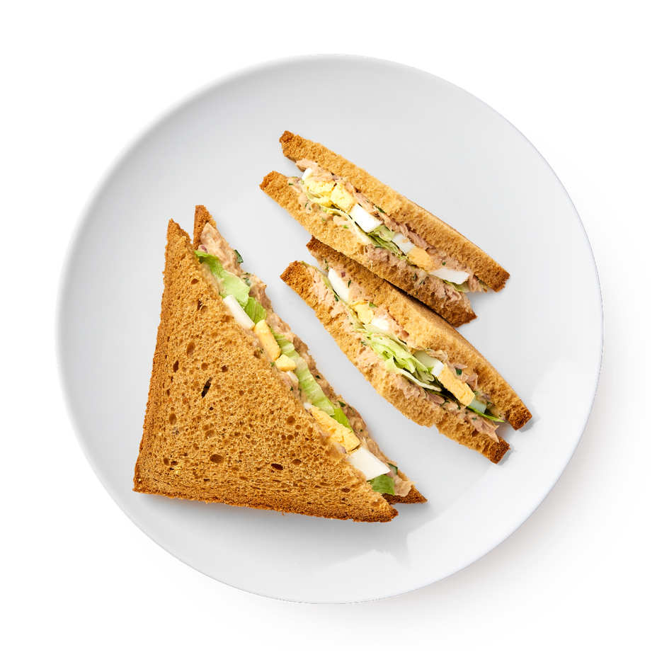 Хлеб тостовый солодовый (мука пшеничная высший сорт, соль морская, дрожжи прессованные, масло сливочное 82% жирности, масло президент, сахар, сухое молоко, солод жидкий), майонез (желток пастеризованный, горчица дижонская, уксус бальзамический винный, соль морская, лимон свежий, масло оливковое, масло подсолнечное, перец чёрный молотый, сахар), зелень петрушка, лук красный, консервированный тунец, соль морская, лимон, перец чёрный молотый