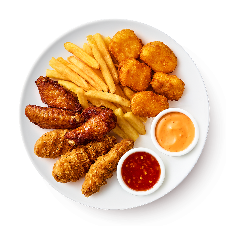 Крыло (плечевая и локтевая части) цыплёнка-бройлера, вода, крахмалы: рисовый, кукурузный; соль, сушёные овощи: томаты, чеснок; специи: перец чили, паприка, чёрный перец; сухой глюкозный сироп, натуральные ароматизаторы (содержат ячмень), аромат перца халапеньо, масло растительное подсолнечное, стабилизатор Е452, регуляторы кислотности: Е451, Е450; сыворотка молочная, травы: петрушка, олеорезин перца белого (носитель: декстроза, соль), краситель экстракт паприки. Мясо курицы, вода питьевая, мука: пшеничная, кукурузная, рисовая; мука из твёрдых сортов пшеницы (дурум), глютен пшеничный, крахмал: пшеничный, картофельный, кукурузный; стабилизатор крахмал ацетилированный, масло подсолнечное, антиокислитель токоферолы, концентрат смеси; соль, лук, перец чёрный, чеснок, кориандр, орегано, кумин, томат, натуральные ароматизаторы (содержат молоко, антиокислители: аскорбиновая кислота, альфа-Токоферол, токоферолы, концентрат смеси; регуляторы кислотности: кислота лимонная, орто-фосфат натрия 2-замещённый; краситель экстракт паприки), экстракт дрожжей, регуляторы кислотности: лимонная кислота, трифосфат натрия (5-замещённый); разрыхлители: гидрокарбонат натрия, дигидропирофосфат натрия; дрожжи, загуститель гуаровая камедь. Сыр «Камамбер» (молоко нормализованное, соль пищевая, мезофильные и термофильные заквасочные микроорганизмы, культура плесени Penicillium Candidum, культура плесени Geotrichum Candidum, молокосвёртывающий ферментный препарат микробного происхождения); сухари панировочные (мука пшеничная высший сорт, вода, дрожжи); вода питьевая; панировочная смесь (мука пшеничная, яичный порошок, крахмал кукурузный, соль, молоко сухое обезжиренное, разрыхлитель гидрокарбонат натрия), масло подсолнечное высокоолеиновое рафинированное дезодорированное. Тесто: сухари панировочные (мука пшеничная хлебопекарная высший сорт, вода, дрожжи хлебопекарные сухие, соль, сахар, масло подсолнечное рафинированное дезодорированное) вода питьевая, смесь муки (мука пшеничная, рисовая мука, кукурузный крахмал, стабилизатор дигидропирофосфат натрия, соль). Картофель, масло растительное – смесь, декстроза моногидрат, стабилизатор E450 (i). Соус тысяча островов: Соус: Вода, масло растительное, паста томатная, сахар, загуститель Е1422, соль, сыворотка молочная, соус ворчестер, белок молочный, регулятор кислотности кислота уксусная, стабилизатор Е415, паприка красная, укроп, пажитник, консервант Е202, кориандр, перец кайенский, ароматизатор натуральный «сливочное масло», ароматизатор «томат», лимон, Соус кисло-сладкий:Вода, сахар, чеснок, уксус спиртовой, соль, перец красный чили дроблёный, загуститель Е1422, загуститель ксантановая камедь, усилитель вкуса и аромата Е627, консервант сорбат калия.