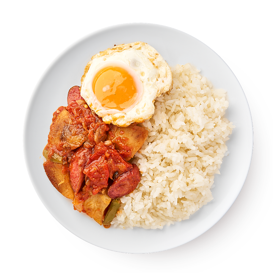 Яйцо, рис отварной (рис, масло растительное, соль пищевая йодированная мелкая), шакшука основа (помидоры, помидоры маринованные, перец запечённый, лук репчатый, масло растительное, сахар песок, соль пищевая йодированная мелкая, зира, кориандр горошек, перец чили, перец чёрный молотый), гарнир картошка с фасолью (картофель жареный, фасоль стручковая, лук репчатый, масло растительное, соус устричный, масло сливочное, крахмал бобовый, чесночное масло, перец паприка сладкий), сосиска говяжья, лук зелёный.