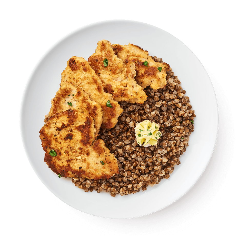 Куриный шницель с гречкой в панировке из сухарей и муки. Можно подать с гарниром или использовать для приготовления сэндвичей.