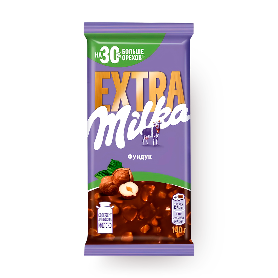 Этот молочный шоколад содержит цельный фундук, который придаёт ему приятную хрусткость. Можно съесть плитку целиком или поделить на дольки.