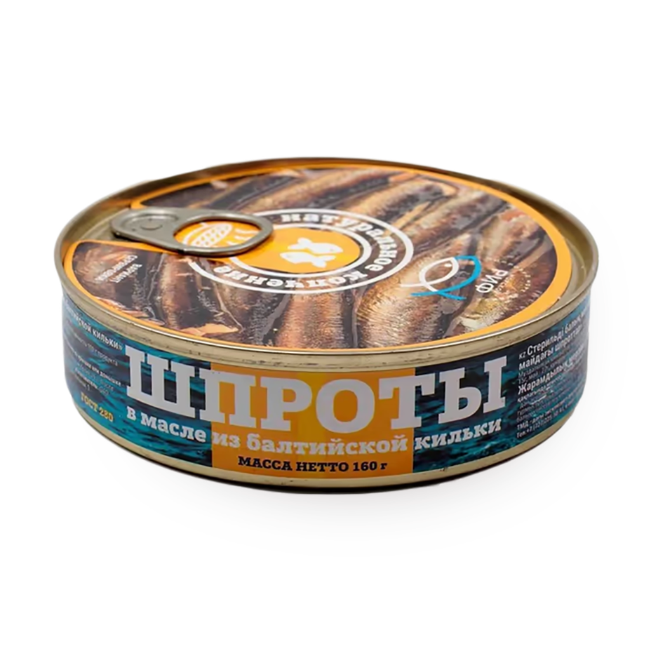 Шпроты из балтийской кильки приготовлены в растительном масле с добавлением соли. Их можно добавить в салат или подать с чёрным хлебом.