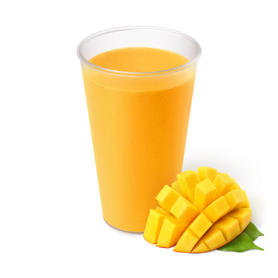 Этот смузи приготовили из мангового пюре и апельсинового сока. Его можно взять с собой или выпить сразу для свежести.