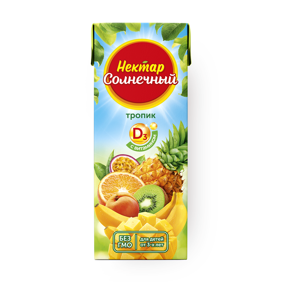 Мультифруктовый сок (соки: мандарина, апельсина, банана, ананаса, пюре: манго, абрикоса, маракуйи, киви); сахар (S) или сахар и глюкозно-фруктозный сироп (G); регулятор кислотности: лимонная кислота; натуральные ароматизаторы; стабилизатор: пектин; краситель бета-каротин, витамин D3; вода.