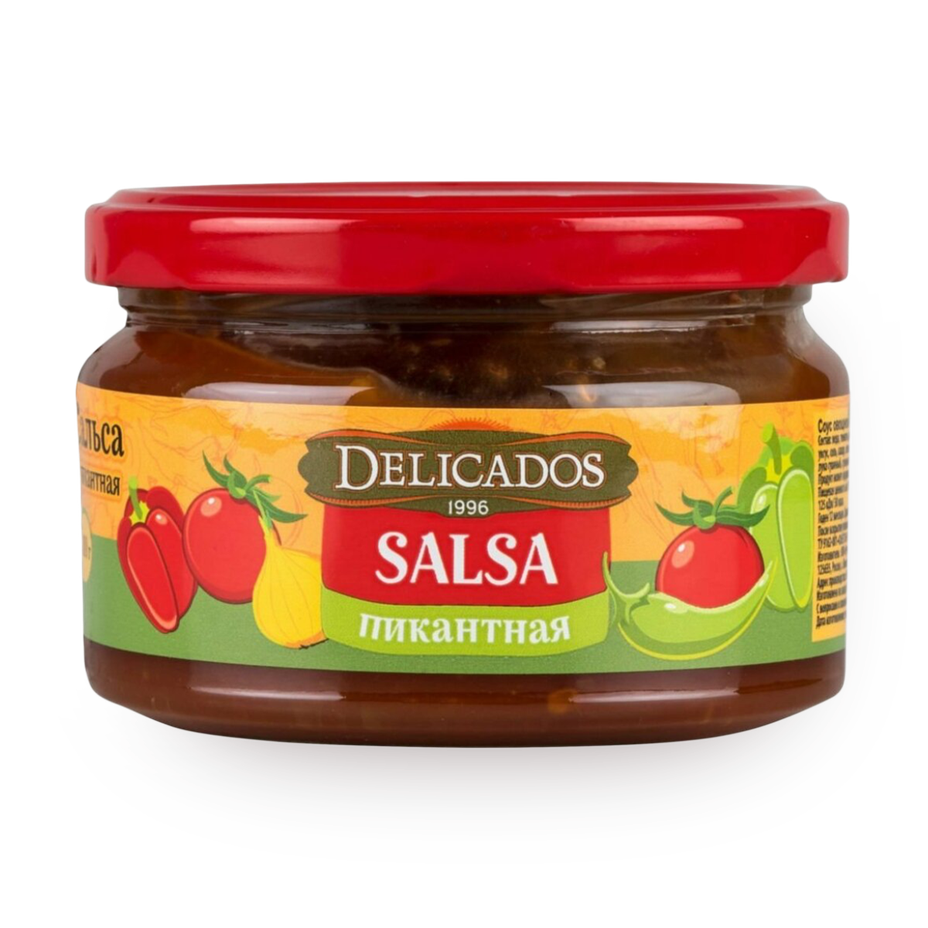 Вода, томаты дроблёные, томатная паста, перец острый «Халапеньо» (ломтики перца «Халапеньо», вода, уксус, соль, сахар, специи), загуститель Е1422, уксус спиртовой, соль, лук сушёный, концентрат лука сушёный, сушёный чеснок, консервант-сорбат калия.