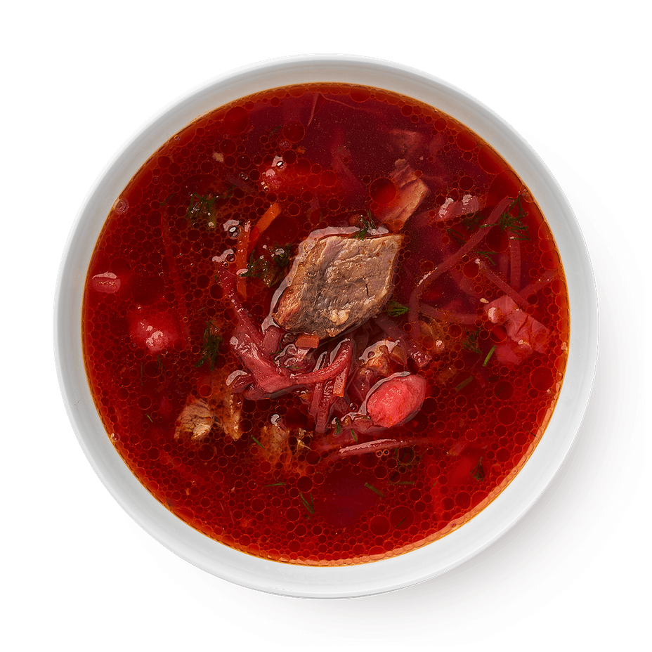 Бульон говяжий, картофель, свёкла, капуста, говядина, морковь, лук, чеснок, паста томатная, сметана, укроп, сахар песок, соль пищевая йодированная, уксус рисовый, специи, укроп.