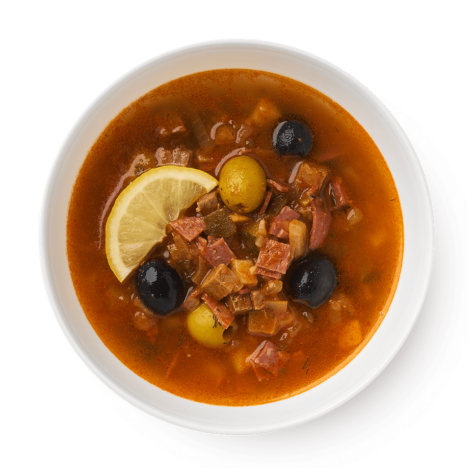 Густой суп с телятиной, солёными огурцами и маслинами, который согреет в холодный день. В составе есть картофель, томатная паста и пряности.
