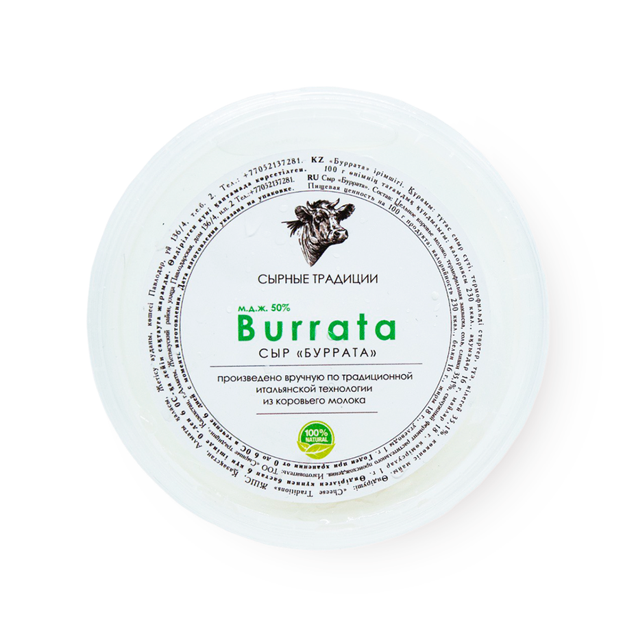 Этот сыр приготовлен из цельного молока и сливок, которые придают ему нежную текстуру. Буррата сочетается с томатами или свежим хлебом.